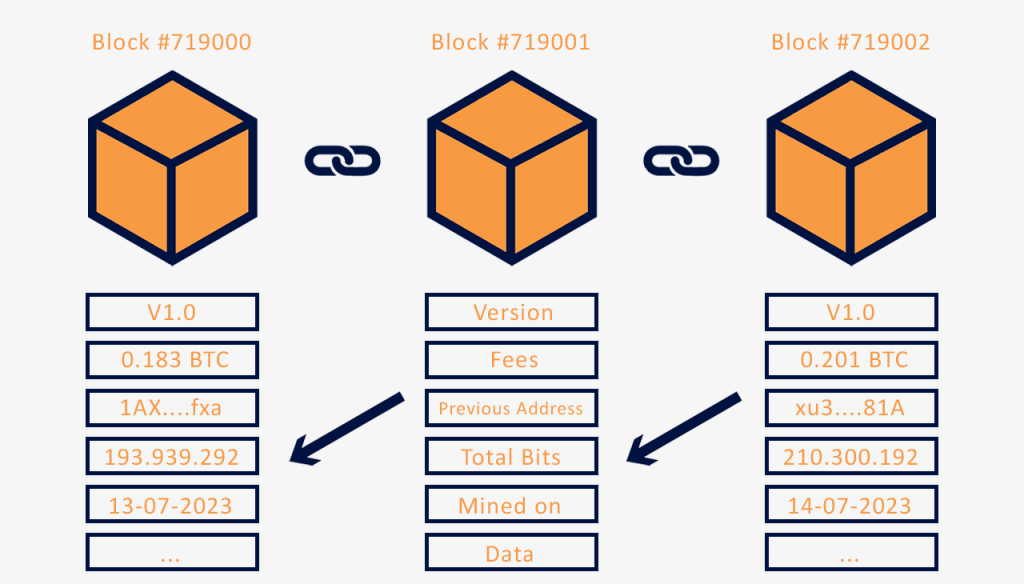 Hierbij het voorbeeld van de Bitcoin blockchain dat een PoW consensus heeft. Wanneer een nieuwe transactie plaatsvindt, wordt deze toegevoegd aan een nieuw block. Dit block bevat ook een cryptografische hash* van het vorige block, waardoor de keten van blocks wordt gevormd. Het proces van het toevoegen van nieuwe blocks aan de keten wordt mining genoemd, waarbij miners complexe wiskundige puzzels oplossen om transacties te verifiëren en nieuwe blocks aan het grootboek toe te voegen.